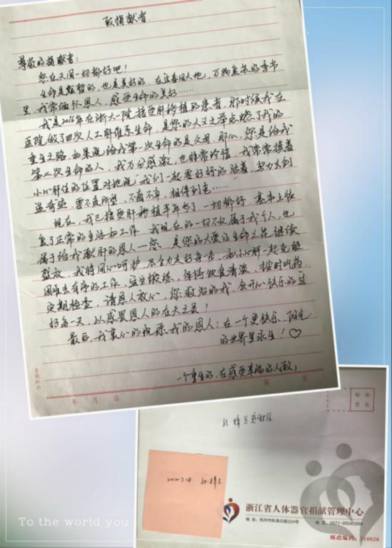 来信的是一位孔女士肝脏的受捐者,信中提到,接受肝移植半年多,一切都好,基本上恢复了正常的生活和工作,他(她)将用心呵护和小心肝一起克服困难,开心过好每一天。此外还在信中如此说:“如果说给我第一次生命的是父母,那么,您是给我第二次生命的人。我万分感激,也非常珍惜,我常常摸着小心肝住的位置对她说‘我们一起要好好的活着’。”