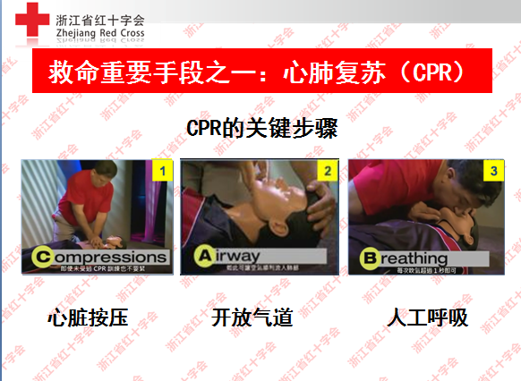 如何识别心脏骤停(心肺复苏指征): 1.无反应; 2.无呼吸; 3.无脉搏(只限定于有医学背景的救护员)。