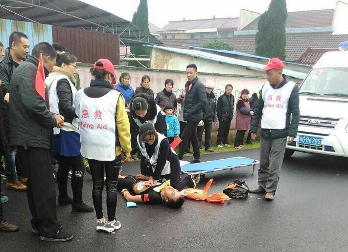 救护车赶到后,红十字救护培训师向医护人员介绍了患者症状及救护情况。运动员被大家一起抬上救护车,之后被送往兰溪市人民医院接受进一步治疗。