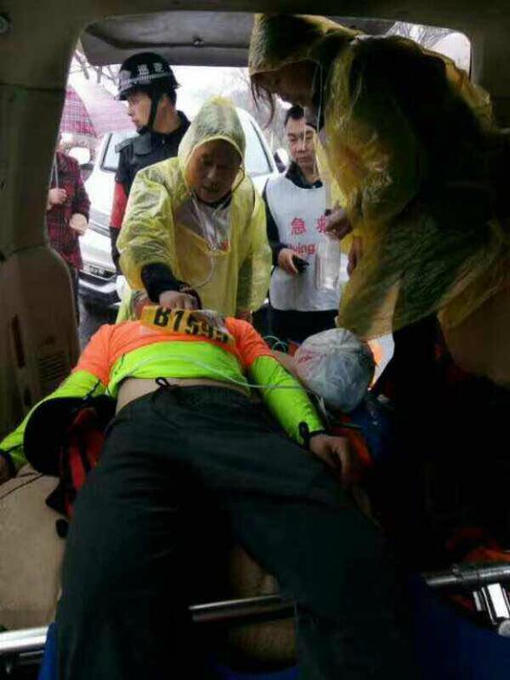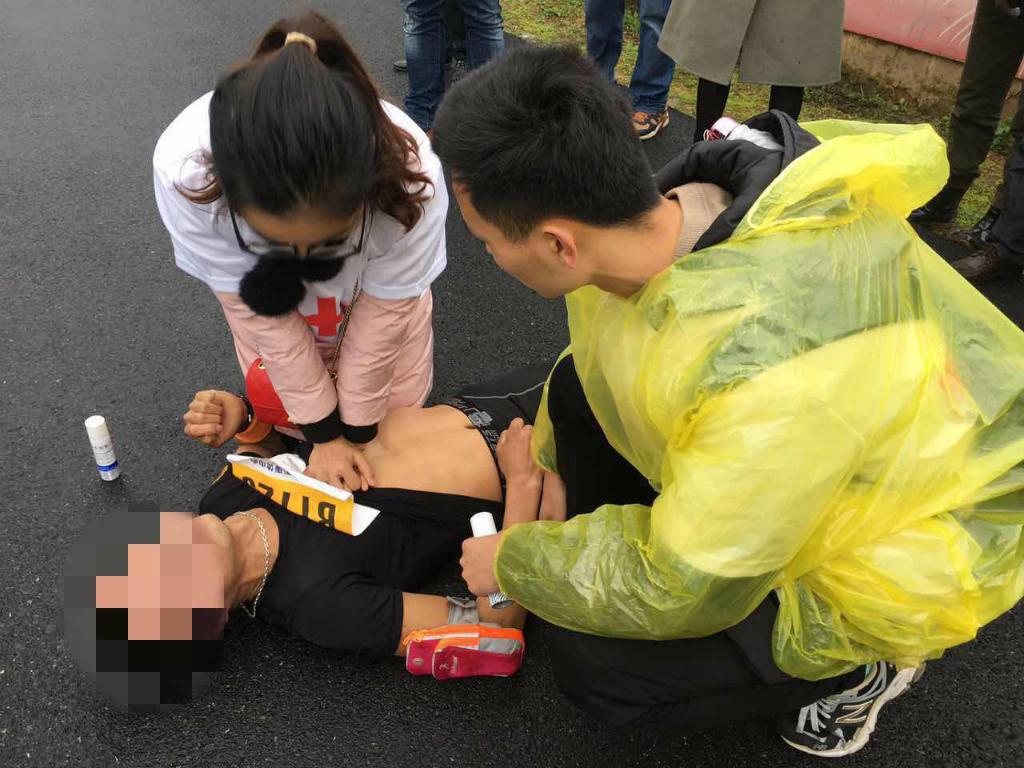 9点34分许,在16.5公里赛段现场,一名运动员突然倒地。一旁的运动员和赛事志愿者立即向医疗点求救。