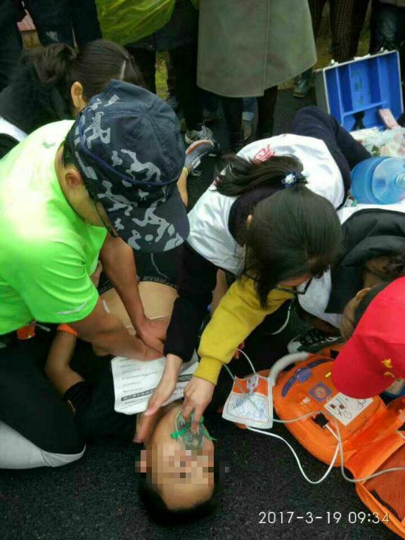 赶到事发地,梅婷娟仔细观察运动员状况。在判断该运动员神志不清、心脏骤停后,梅婷娟等人迅速运用AED为患者进行体外除颤。之后,立即心肺复苏。
