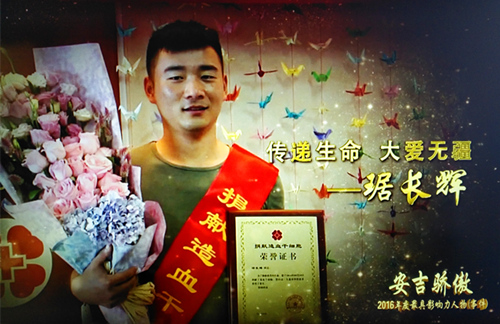 来自湖州市安吉县天子湖镇迂迢村造血干细胞捐献者琚长辉入选“安吉骄傲——2016年度最具影响力人物(事件)”,现场由浙江省造血干细胞捐献者资料库管理中心主任季云松为其颁奖。