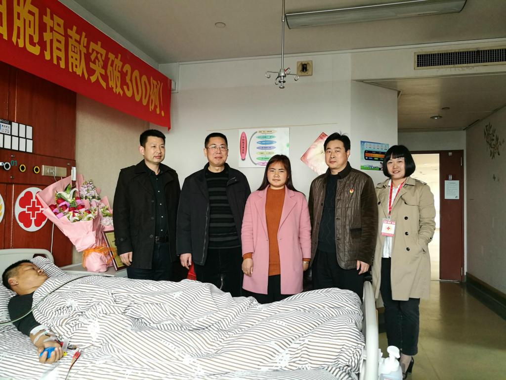 2月28日上午,浦江县第六例造血干细胞捐献在省中医院成功实施,省红十字会造血干细胞资料库中心主任季云松、浦江县副县长张卫东前往慰问捐献者钟卫峰。张县长对钟卫峰说:“你能义无反顾无私捐献救人性命,这值得我们大家学习!” 县府办副主任严龙顺,县红十字会党组书记、专职副会长黄晓红陪同慰问。