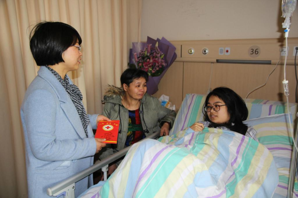 2月28日,嵊州市红十字会有关人员到嵊州市人民医院看望患结肠癌的90后女孩张洁,并送上救助金。