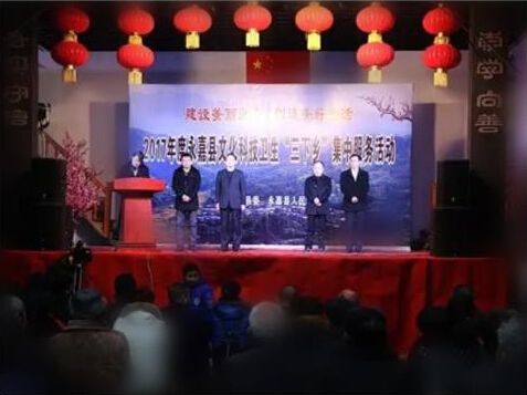 金猴留恋丰收年,彩凤欢啼盛世春。1月18日,以“建设美丽永嘉,创造美好生活”为主题的2017年度文化科技卫生“三下乡”集中服务活动开幕式于枫林镇湖西村举行。 在湖西村文化礼堂活动广场上,永嘉县红十字会等26个部门单位开展送物资、送书籍、送知识、送服务等活动。活动现场,应急救护讲师胡文默与现场群众互动,现场演示心肺复苏和止血包扎技能,鼓励群众参与应急救护培训。县红十字会工作人员向群众分发应急救护书籍、应急救护课件光盘及包装盒印有造血干细胞和器官捐献宣传标语的物资,场面十分热闹。