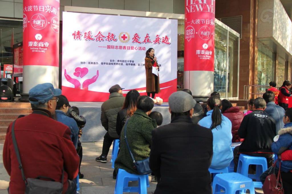 12月3日,余杭区红十字会联合区献血办、临平桂芳桥社区、临平银泰、区汀州学校、图索画室在临平银泰小广场举行迎“国际志愿者日”——“爱在身边 情暖余杭”爱心活动,现场“红十字教你学救护”、“我为‘12•