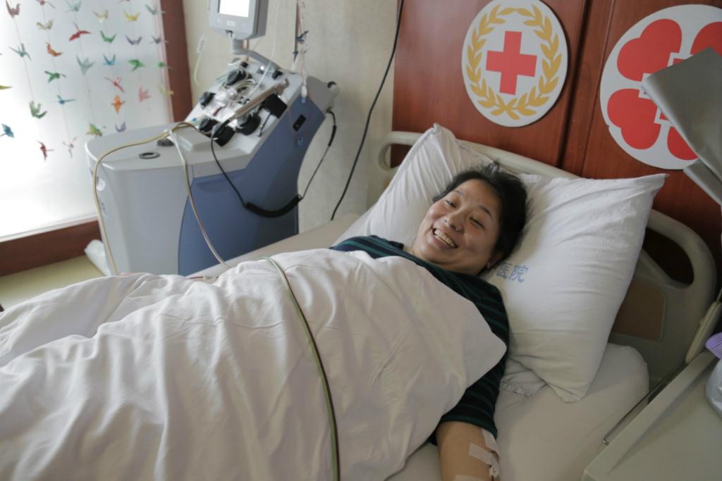 躺在采集床上的肖金凤尽管双臂插着采集管无法活动,但脸上始终洋溢着微笑,言语间的激动之情难以掩饰,她说:“有那么多人加入到造血干细胞捐献志愿者队伍中,可是真正有机会救人的有几个?我能有机会拯救一个生命,这是我的幸运!我现在她最大的愿望就是快点把采集完的造血干细胞输入到患者身体力,希望他能早日康复。”肖金凤的丈夫一直默默地守在床边,他盯着肖金凤床边不断更新数据的分离机,不时查看一下肖金凤插满采集管的双臂,时不时询问她有没有不舒服?感觉怎么样?要不要喝水?看到她坚强而微笑的回答说:“感觉还好的,老公放心吧!”作为丈夫虽然心里有些不舍,但看到她那么坚强,也就放心了。