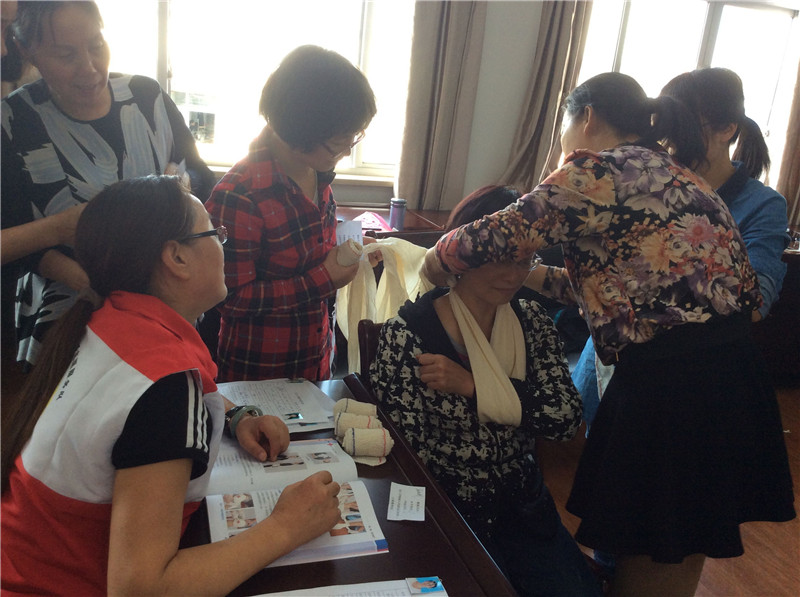 两天时间,所有志愿者经历了一次强大的头脑风暴。第一天学习的内容有红十字运动的起源、应急救护的概念以及心肺复苏技术,第二天学习的内容有气道异物梗阻救助、事故现场检伤分类、现场应急救护四项技术(止血、包括、固定、搬运)……大家听着记着,一边还动手模仿着实践着,一个个学得是那样认真。尤其是实操环节,大家争先恐后地在模拟人身上练习心肺复苏、AED的使用,或者两个一组翻来覆去地用绸带、三角带练习着包扎技术,他们一边实践一边背诵着操作口诀,直到个个基本掌握。