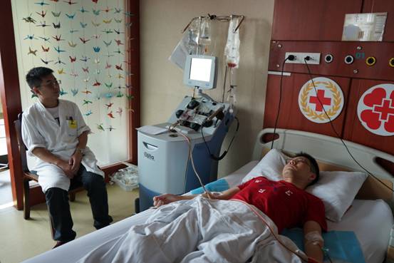 半个月后进行了第二次体检,在这个等待结果的过程中,韩炬彬隔几天就会打电话到区红十字会,询问体检报告有没有出来、结果怎么样。通过与他的交流才知道,前几年他们系统就有一位同事因患白血病最终没能进行造血干细胞移植而离开了他们,原因是最后关头志愿捐献者反悔了,而这个时候他的同事已经进仓,消除了自身的免疫力,这个过程是不可逆的,由于找不到相配的志愿捐献者,最终导致无法挽救的结果。一想起自己身边曾经发生过的事情,从一开始来征求他意见开始,他就默默地许下了诺言,一定要完成这次捐献,完成一次生命的接力。第二次的体检报告出来了,全部指标都在合理范围内, 9月22日下午,在区红十字会工作人员的陪同下,农商银行还专门派了专车送韩炬彬到省中医院。采集造血干细胞前需要每天打一支动员剂,促进造血干细胞从内周血动员到外周血,动员剂在第2支之后开始有一些轻微的反应,头痛、腰腿酸痛等,有点像感冒的症状,但并不影响活动和休息。9月26日,是采集造血干细胞的日子,早晨6点多韩炬彬就早早地起床来到了医院,经过抽血化验,采集机器和器材的准备,8点多正式开始采集,采集造血干细胞的量,要根据患者的体重以及采集的效果来确定,机器在经过6个多小时运转后停了下来,整个采集过程顺利完成,韩炬彬脸上露出了微笑。