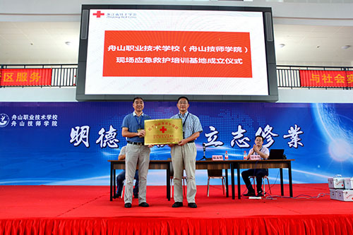 9月14日上午,舟山职业技术学校(舟山技师学院)现场应急救护培训基地成立仪式在校体育馆举行。市红十字会副会长叶跃胜为基地授牌,舟职技校校长杨永明出席成立仪式。