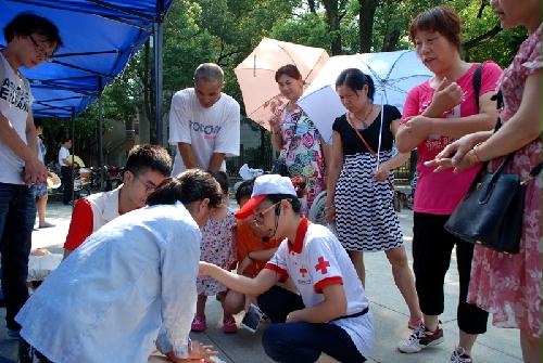 尽管烈日炎炎,活动现场仍有吸引上百位市民热情驻足参与。在红十字宣传服务区,工作人员和志愿者们分两组给现场的群众进行了志愿服务。一方面向市民介绍现场救护知识,并发放了现场救护培训手册、红会宣传资料等。另一方面向前来学习救护知识的村民简要而耐心地讲解了心肺复苏术的急救要点,并进行了现场示范操作。市民们自发地围成圈,饶有兴致地听红十字会人员的讲解,并频频点头表示赞叹。讲解完毕后,市民们兴致勃勃,跃跃一试,从小朋友到七旬老太,都亲手体验了动作要领,红会人员对参加体验者均手把手进行了指导,并向他们发放了小礼物。市民们在体验中纷纷表示“现在天气炎热,家里有老人、小孩,能有机会学习这项急救技能真的很不错……”,还有不少老人带上孙儿(女)一起学急救。