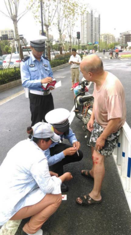 正在机神岗执勤的江干区交警东站枢纽中队的赵高飞、周崯、司明伟、刘嗣威等四名学警发现后第一时间赶到现场,扶起摔倒在地上的电动车和老大爷,并各司其职开展工作:司明伟拿出对讲机请示附近民警,刘嗣威搀扶老大爷检查伤势,周崯拿出随身携带的“江干区红十字便携式急救包”;赵高飞则利用近期参加“红十字交警专场急救培训”所学的知识帮助老大爷紧急处置擦伤,并合力将老大爷扶至就近的“117医院”机场分院。