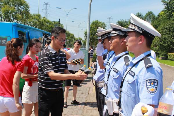 江干区红十字会党组书记、常务副会长张秋萍,浙江太古可口可乐饮料有限公司公共事务及传播部徐珂文经理一行在江干区交警大队教导员傅渊的陪同下,来到交警大队和八堡交警执勤岗,向工作在一线的交警捐赠了毛巾、矿泉水、饮料等防暑降温用品,将社会各界的关爱交到一线执勤交警手中。可口可乐公司徐经理表示:每次经过交通路口,看到交警们顶着炎炎烈日指挥交通都十分感动,这次能通过红十字会这一公益平台开展为交警送清凉活动,一方面是为了通过公益行动彰显企业社会担当,同时也呼吁全社会都来关注和支持交警工作、关爱交警身心健康。