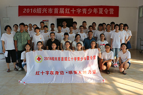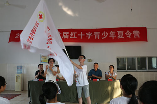 最后,市红十字会党组书记、副会长、执委会主任郑杰为营员授旗,并宣布2016绍兴市首届红十字青少年夏令营开营。
