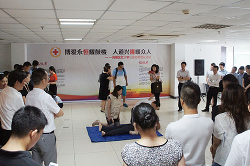 海曙区红十字会积极拓展组织发展,在全区街道、学校、医疗卫生单位,以及80%的社区建立红十字组织的基础上,结合城区特点加强社会调研,深入挖掘整合社会公益资源,7月13日成立了全市第一家以商务楼宇企业集群为模式的组织-----恒隆中心红十字会,成立仪式现场100多名企业红十字志愿者还开展了应急救护培训、公益志愿墙签名、高楼应急逃生演练活动。市红十字会党组书记、常务副会长金黎萍,区人民政府副区长、区红十字会会长薄慧敏出席成立仪式活动并讲话。