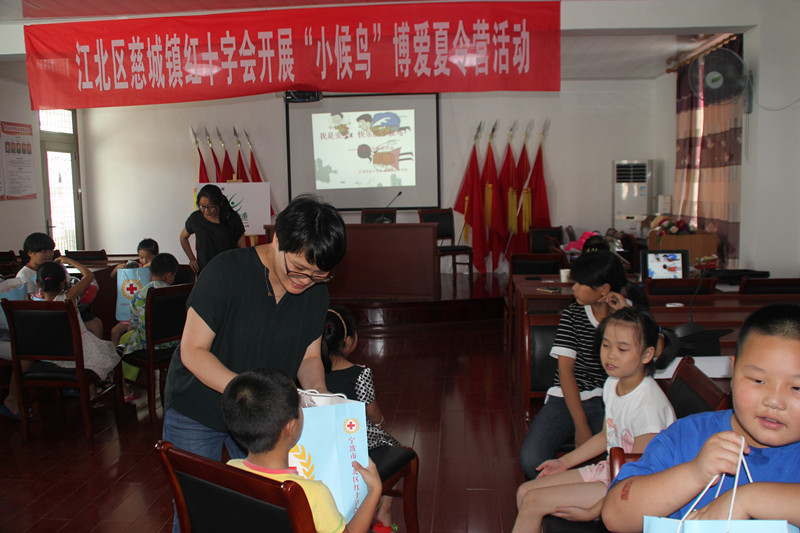 作为江北区红十字会的暑假传统博爱项目,今年的“关爱‘小候鸟’暑期欢乐行”夏令营丰富多彩。组织“小候鸟”梦想行动,帮助50多名 “小候鸟”实现了微心愿。组织“小候鸟”救护行动,开展“我是小小救护员”为文题的救护知识学习活动,教会他们防溺自救、交通出行、食品卫生、火灾逃生等意外发生时的应急措施。组织“小候鸟”博爱行动,有组织地开展爱自己、爱他人、爱自然的系列活动。组织“小候鸟”书包行动。购置了每份价值300元装满铅笔盒、卷笔刀、计算器、直尺、圆规的爱心书包,400名“小候鸟”都得到了这一人道关爱。组织“小候鸟”兴趣行动,免费开放区文化宫以及文化体育设施,充分发挥回乡大学生、志愿者等队伍作用,组织“小候鸟”进行社会实践、科技实验和各类文化体育活动,丰富暑期精神文化生活。组织开“小候鸟”健康行动,联合爱尔光明眼病医院组织“小候鸟”到医院体验感受医生工作,开展爱眼护眼知识讲座,免费给“小候鸟”进行视力检查。