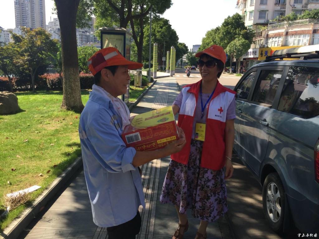 高温下,大街小巷总有一群环卫工人为清洁奉化城市而辛勤劳作。7月4日,奉化市红十字博爱志愿服务队和爱心企业“奉化凌晨农副产品配送中心”给环卫工人送饮料. 下午2点多,奉化市红十字博爱志愿服务队和爱心企业,把饮料装上车后,立刻出发为在工作岗位上辛勤劳动的环卫工人送上清凉饮料。