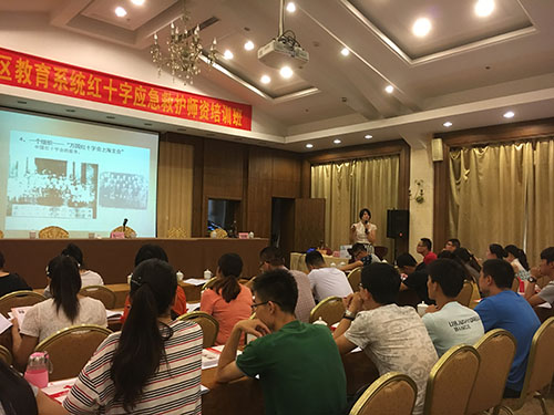 开班仪式后,杭州市红十字会赈济救护部陶一二为大家授课,介绍红十字运动知识,让老师们对红十字运动的起源和发展有了进一步了解。
