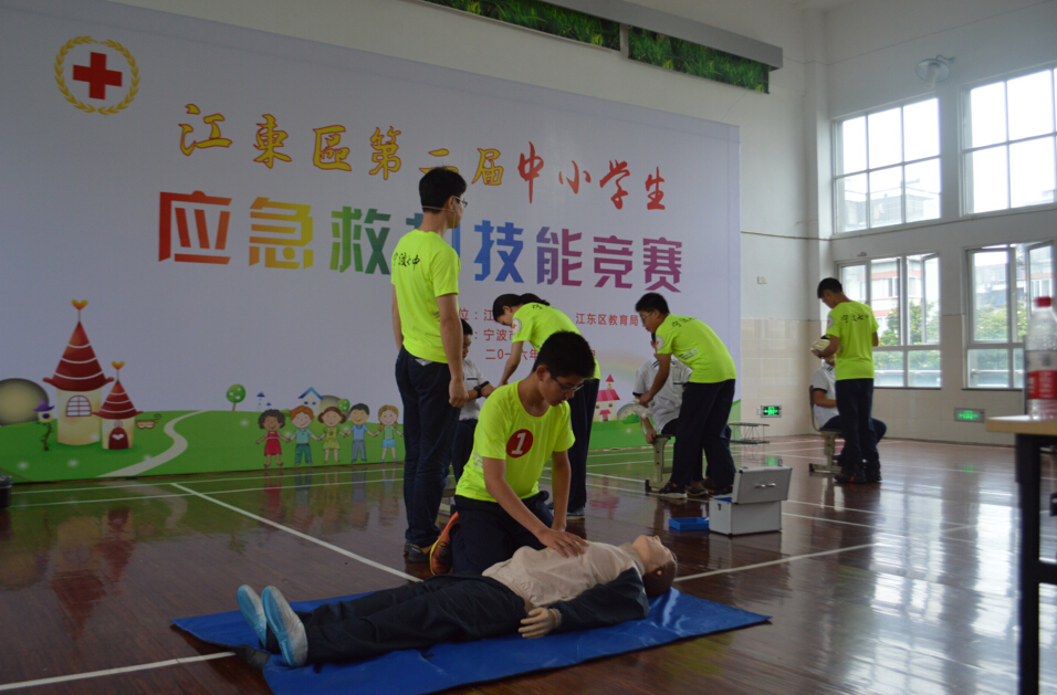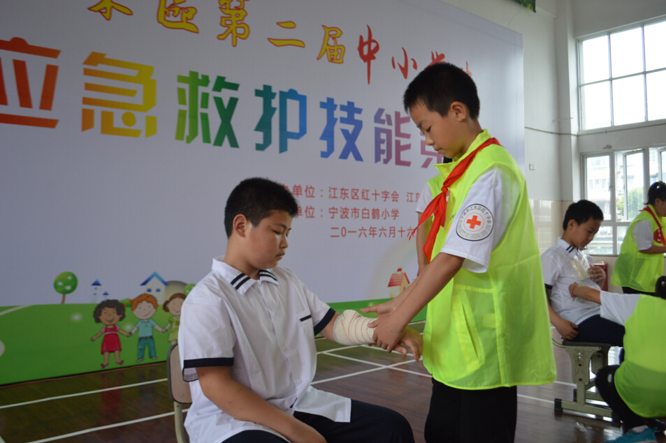6月17号下午,宁波市江东区第二届中小学生应急救护技能比赛在宁波白鹤小学举行,来自全区21所中小学22支队伍参加,江东区教育局党委委员、纪委书记陈仁飞以及江东区卫计局调研员、区红十字会党前组书记、专职副会长郑智玉莅临观看。