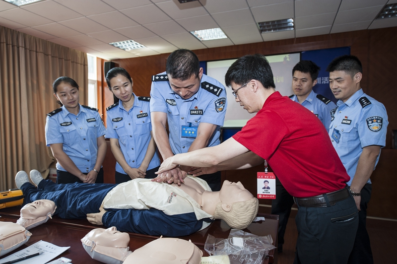 “切实增强一线民警的警务实战技能,坚决打赢G20峰会安保攻坚战提供强有力素质保障。”绍兴市红十字会与绍兴市公安局联合,在6-7两个月时间,对全市一线公安民警、协辅警等开展红十字应急救护技能培训,本次培训侧重于开展针对性的实战技能训练,从安保实际出发,专门设计了以心肺复苏(包括AED的使用)、创伤救护基本技能(止血、包扎、固定、搬运)、溺水急救等项目的基本技能操作为主要课程。本次培训为市县联动,合作推进,采用“送教上门、无偿公益”形式开展,最大程度解决好受训人员的工学矛盾,方便学员就近就便参与学习。