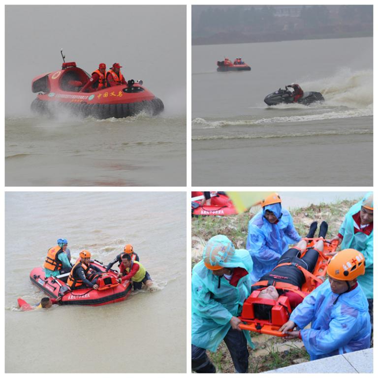 参加这次水上救援演练的有8支队伍,他们分别是东阳、义乌、永康、浦江、武义、金东的红十字救援队,以及市红十字心理救援队和赈济救援队。演练的项目有:水上直升机救援、气垫船救援、橡皮艇救援、潜水救援、水下机器人搜救、抛绳救援、橡皮艇翻船自救、现场心肺复苏急救、心理疏导等十多个项目。市委常委、市常务副市长金中梁到现场观摩整个演练的过程,检阅了参加演练的全体红十字救援队员和装备,金市长在讲话中充分肯定了这次演练所取得的成绩,他说:这次演练活动中,各支参战队伍认真履行职责,密切配合,协同作战;各参战人员精神饱满,服从指挥,熟练使用各种器材装备,使其发挥最佳优势;现场指挥员指挥得当、合理调配部署救援力量,以最快的速度抢救落水人员,把人民生命财产损失降到最低限度,充分展示了我市红十字应急救援队伍良好的专业素质、严明的组织纪律和顽强的拼搏精神,标志着全市民间救援水平和应急能力又上了一个新台阶。