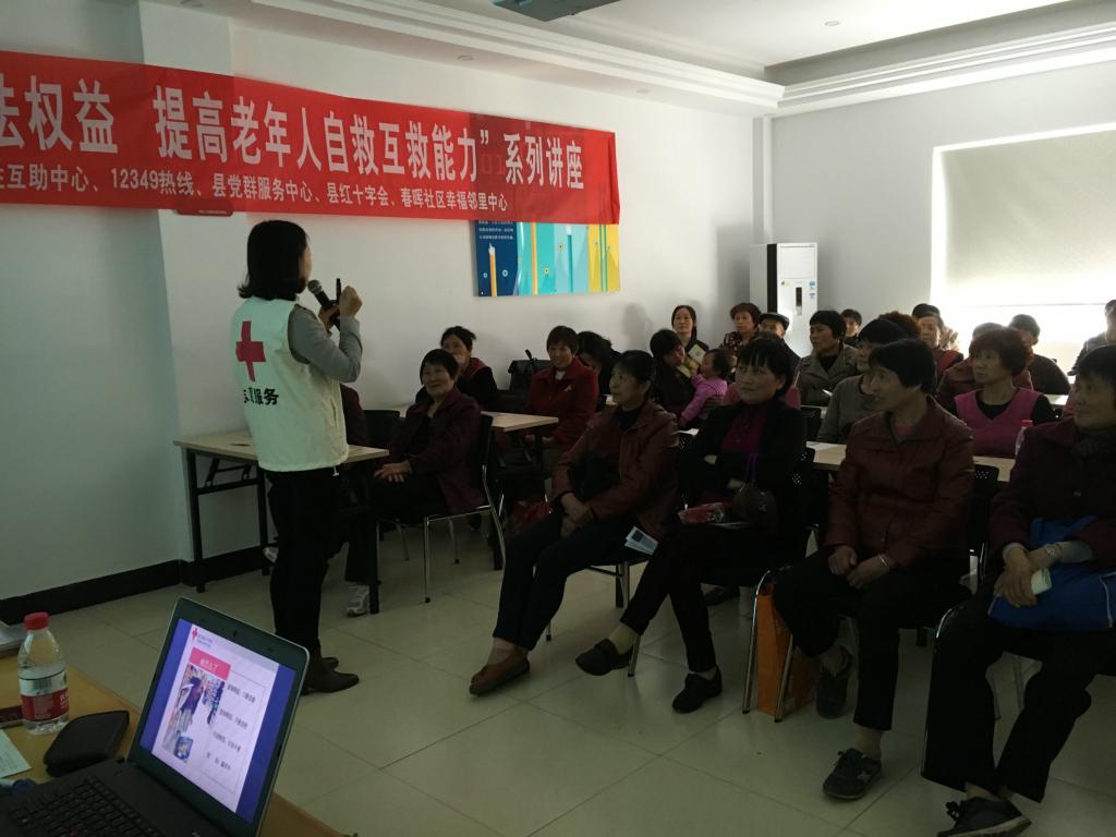 3月7日,由金阳光互助中心、12349公众服务热线、德清县红十字会主办的2016“今日微公益”免费服务进社区活动,在武康街道春晖社区回南小区开展,受到广大居民的热烈欢迎。 现场除了免费理发,免费修理电器外,县红十字会还在社区二楼的会议室开设了老年人急救知识课堂。许春晖老师通过假人示范、现场答疑等方式向老年人讲解了糖尿病、高血压等疾病的预防和治疗,中风、心脏病等突发疾病的急救应对和技巧,讲课浅显易懂,课堂气氛相当活跃,得到社区老人的一致好评。