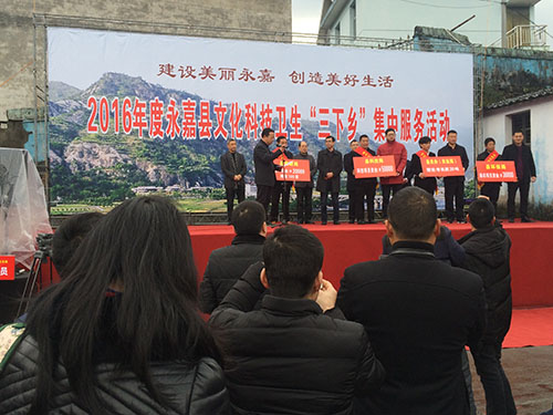 2月1日,由永嘉县委宣传部牵头组织开展的2016年文化科技卫生“三下乡”集中活动在沙头镇福利村居家养老服务中心举行。为助力全县农村精神文明建设,县红十字会副会长徐俊带领红十字志愿者一行人积极参加了本次活动。