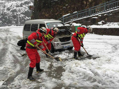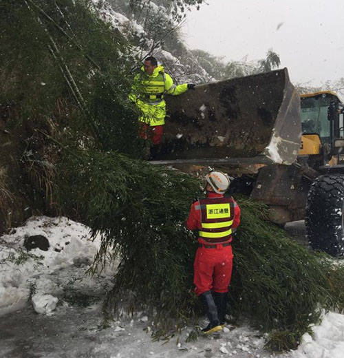 诸暨市红十字会立刻派出正在整装待命的红十字救援队前往赵家,一同与镇政府一起进行紧急抢险。到达赵家东溪村的救援队根据当时情况分成两组,一组前往宣家山,一组前往相泉村。救援队与推土机、铲车一同作业,将山路上的积雪进行清理,将被压倒挡住道路的毛竹树木进行砍伐、清理,以最快的速度使道路通畅。在清理山路时,将被困的车辆进行紧急救援,护送到安全地带。