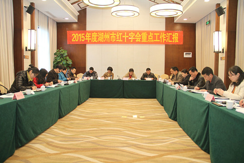 12月18日,湖州市红十字会在安吉召开2015年度全市红十字会重点工作汇报会。市红十字会党组书记、常务副会长吴康丽讲话,党组成员、秘书长郭建根主持,各县区红十字会专职副会长、秘书长和会机关全体人员参加会议。