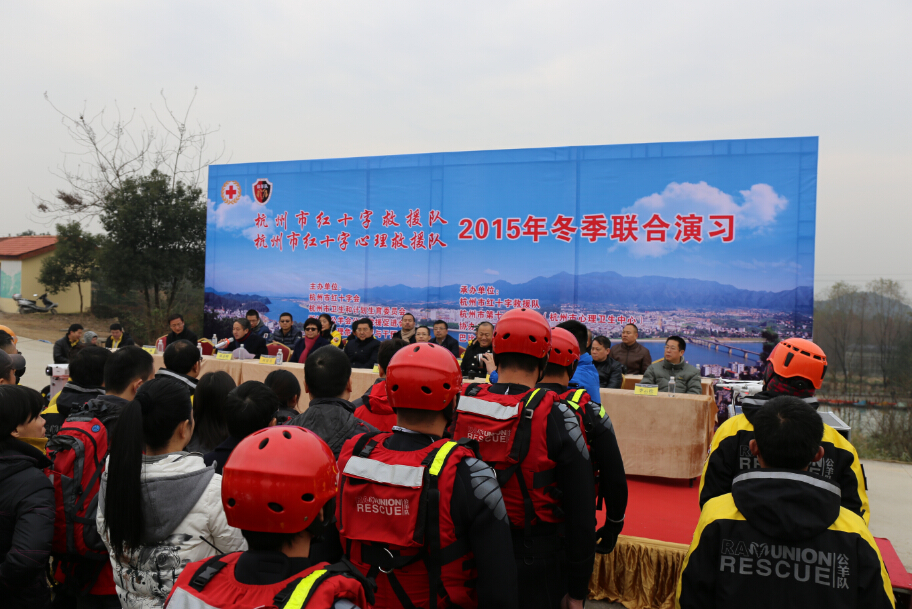 12月19日,杭州市红十字救援队联合市红十字心理救援队在桐庐大奇山脚下开展2015年冬季联合演习。 省红十字会专职副会长高翔、市卫生和计划生育委员会副主任方建国、市红十字会常务副会长周志明、公羊会全国委员会主席何军赴现场观摩指导演习。
