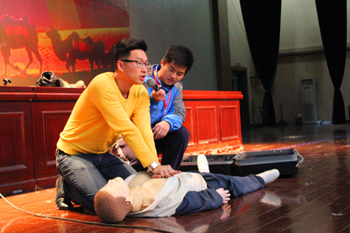 讲座的第二部分为“现场应急救护”培训,在第一天的讲座中,团委马彦老师细致耐心地给同学们讲解了创伤救护、心肺复苏的基本技能,并且现场指导学生利用绷带和三角巾进行应急救护的包扎演练,在校红十字会队员的协助下现场模拟心肺复苏的正确操作练习,提升了学生的直观感受和实践技能水平,使现场的同学们了解了急救的基本要领。在第二天的讲座上,团委杨缘缘老师主要向同学们讲解身边几位常见的意外紧急情况如出血止血、烧烫伤、溺水、触电、交通事故、蛇虫犬咬伤等等的现场应急救护知识和基本技术。随后,应急救护老师在协助人员的配合下,现场演练了胸外心脏按压、人工呼吸、溺水抢救等应急救护时伤者的体位和救护操作方法。