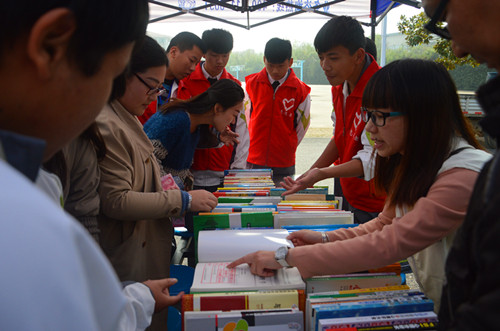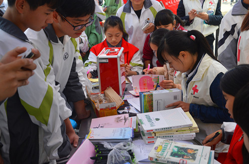 十一点,由红会派专车将书籍、赠品和宣传用品等专程送到学校后,团委的志愿者仅用十五分钟就将场地安排就绪,红十字心理健康志愿服务队也对此次活动非常重视,共派出张媛、俞文奇、裘燕、郭红梅、缪倩芸、刘桂侠6位咨询师志愿者,11:25学生一下课,两个摊位前就挤满了学生和老师,各位志愿者纷纷投入到各自的岗位,原有安排的心理咨询和现场测试组人员全部投入到书籍捐赠和义卖活动中,直到一点活动间隙才抽空吃了午饭。每人都被湖州交通学校师生的热情所打动,虽然饿着肚子,但仍坚持做好书籍的登记、盖章,捐赠钱款的收集,赠品的发放等工作,紧张却有序。