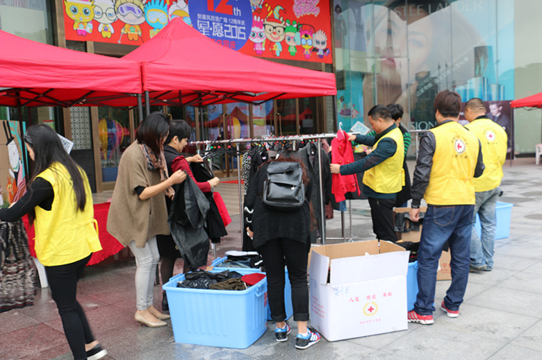诸暨市红十字会动员红十字志愿者,提前将爱心人士捐赠的服装进行分类整理,准备积极参与到此次的慈善义卖活动中去。