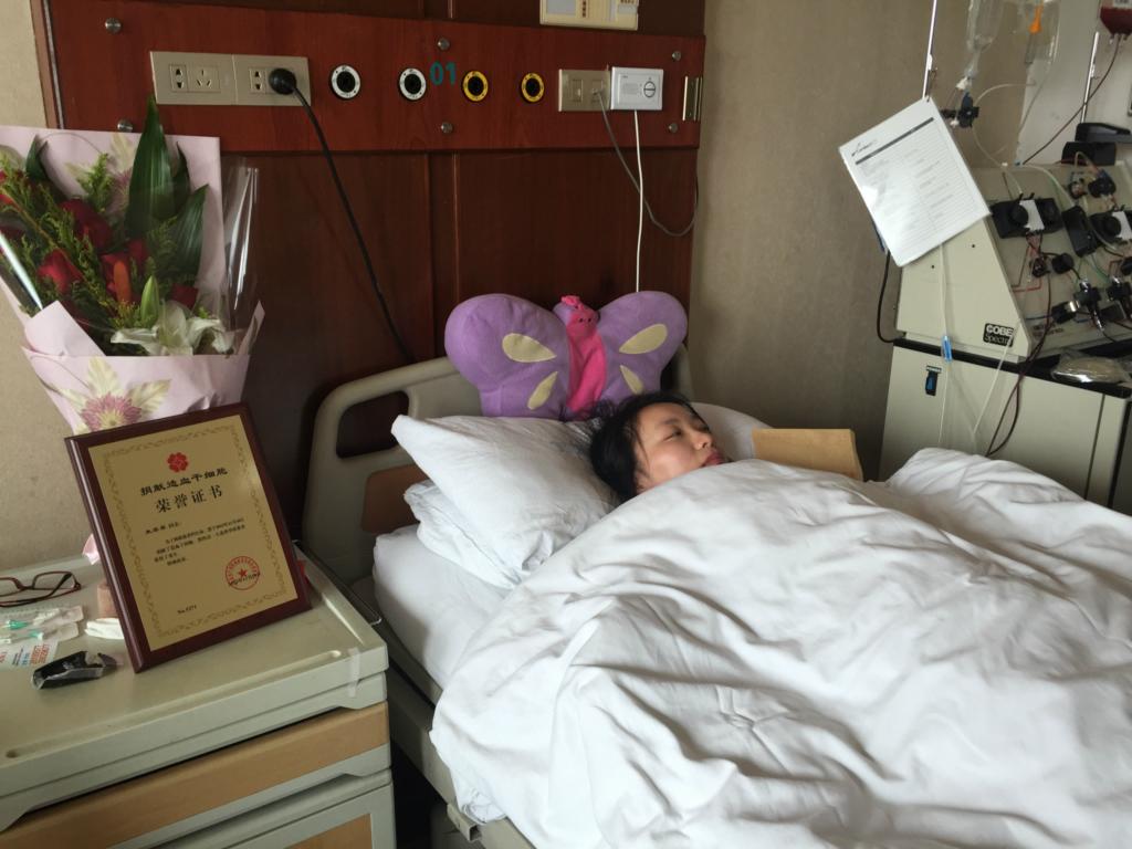 11月10日,在浙江省中医院造血干细胞采集室里,在萧山工作的山东姑娘正在进行造血干细胞捐献,她的名字叫朱翠翠,2009年她的姐夫在广州也捐献过造血干细胞。