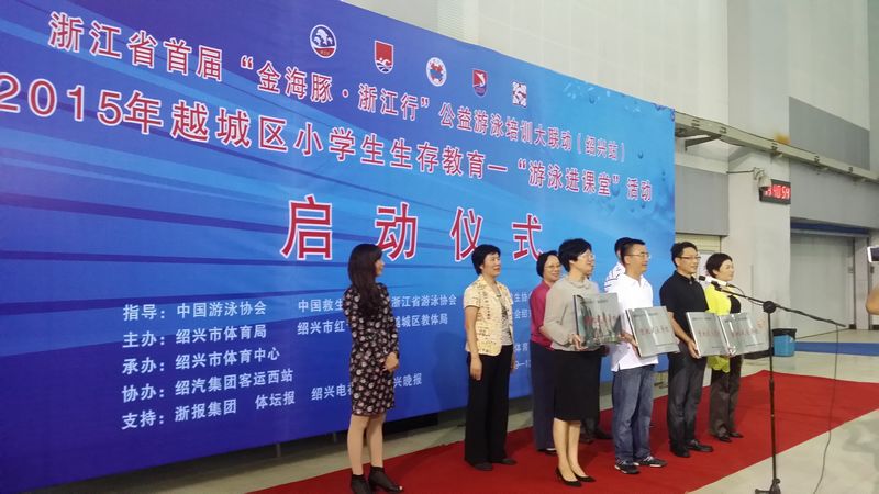 2015年9月29日,浙江省首届“金海豚·浙江行”公益游泳培训大联动(绍兴站)暨2015年越城区小学生生存教育—“游泳进课堂”启动仪式在绍兴体育中心游泳馆举行。来自省救生协会、市体育局、市红十字会、市体育中心、越城区教体局、鲁迅文化基金会绍兴代表处的领导与各试点学校的学生一起,见证这个形式简约但意义深远的成长奠基时刻。