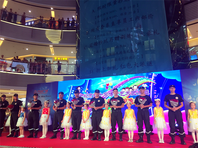 在当天的首场演出上,魏会长和艺术团的小朋友为前不久出征温州平阳,展开灾区救援工作的红十字战狼救援队的12位勇士献上了鲜花。艺术团精心创编的情景剧小品《啥也不妨碍》,生动地演绎了舜宇集团员工魏锋捐献造血干细胞的爱心故事。从家人的思想波动到全力支持,再到魏锋光荣升级成“奶爸”,剧情跌宕起伏、引人入胜。当小品主人公原型魏锋上台接受鲜花祝福时,观众们致以热烈的掌声,经久不息,把晚会的气氛推向高潮。