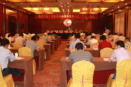 6月12日,衢州市红十字会第四届理事会第三次(扩大)会议召开。会议学习传达中国红十字会第十次全国会员代表大会精神,报告2014年工作情况和2015年重点工作计划,审议2014年度捐赠款物接受和使用情况、更换理事、聘请名誉会长等报告,通过了有关决议。市红十字会各位理事、各县(市、区)红十字会专职副会长共70余人参加会议。市委副书记江汛波、副市长陈锦标出席会议并讲话。会议选举陈锦标副市长为市红十字会会长。