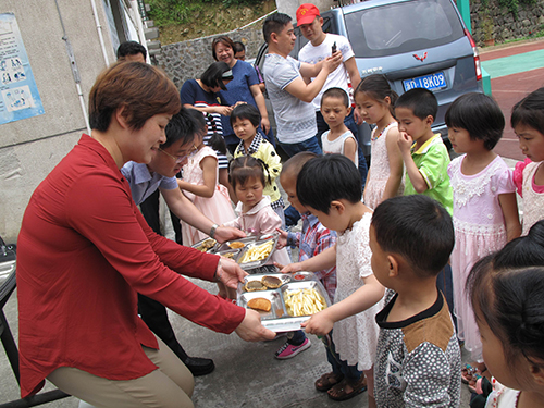 6月1日上午,嵊州市红十字会“2015红十字博爱行”活动走进通源乡中心学校,来自柏星超级大酒店的红十字志愿者和市红十字会机关工作人员一行10余人为山里孩子送去了节日的问候和祝福。柏星超级大酒店向孩子们赠送了酒店员工捐赠的580册书籍,并现场制作绿茶饼、油炸冰淇淋和薯条等食品,为每位孩子提供一份精美的点心,让不少孩子尝到了从未吃过的美食。市红十字会赠送了衣服、玩具等爱心物资,并向5名贫困学生发放了嵊州农村合作银行博爱助学金。嵊州市红十字会党组书记、执委会主任裘庆军和柏星超级大酒店总经理钱柯慧参加了当天的活动。