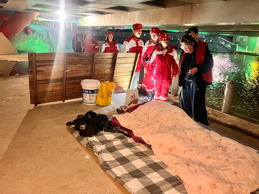 11月17日傍晚,气象台发布寒潮预警,预计次日气温将大幅走低。为筑牢流浪乞讨人员生命安全防线,温岭市红十字红豹救援队与温岭市救助站迅速联动,组建专项巡查小组,连夜启动“寒冬送温暖”专项行动,对市区体育馆、东辉公园、前溪桥洞等流浪人员易聚集区域,开展拉网式排查与劝导救助。