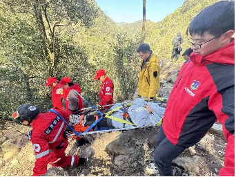 确定伤员位置后,队长李甬江迅速带领队员携带船型担架、急救包等专业设备赶往现场,并及时找到受伤人员。在完成初步伤情判断与肢体固定后,救援人员使用担架将伤员向山下转移。