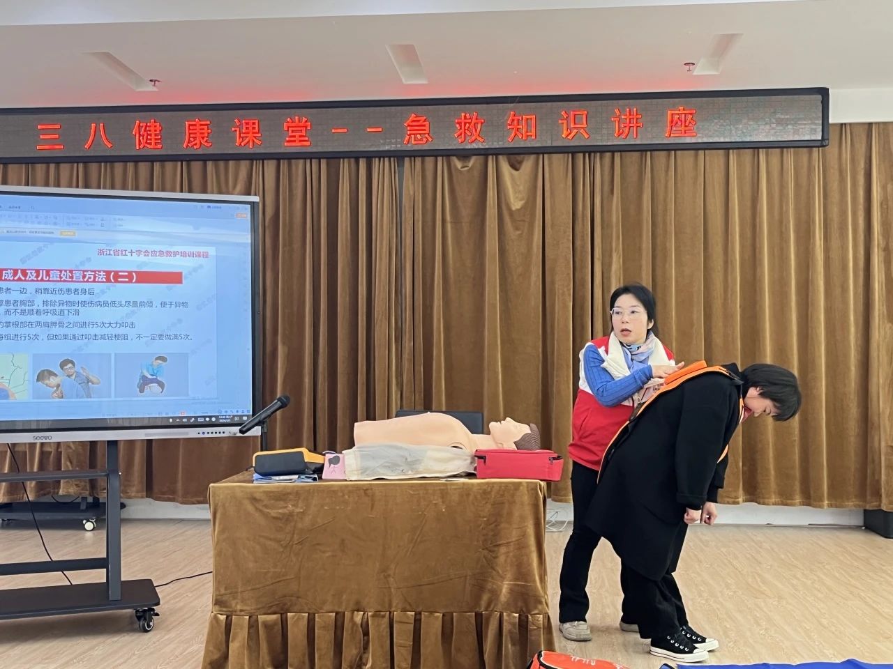 课堂上,红十字应急救护师采取“现场授课+实操体验”的模式,就心肺复苏术、AED的使用以及海姆立克急救法等应急救护知识和技能进行了详细讲解和演示。大家兴趣浓厚、踊跃尝试,轮番上阵,在老师手把手地指导下,逐渐熟悉胸外按压、气道开放、人工呼吸等操作步骤,很快掌握了心肺复苏的基本技能。