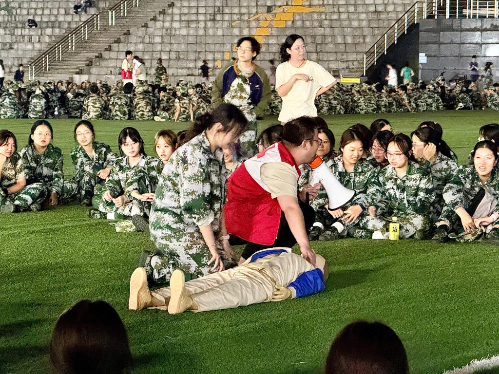 身穿迷彩服的新生们认真听讲、踊跃参与,在应急救护师的指导下借助模拟人进行反复练习,逐步掌握胸外按压的深度、频率与动作规范。