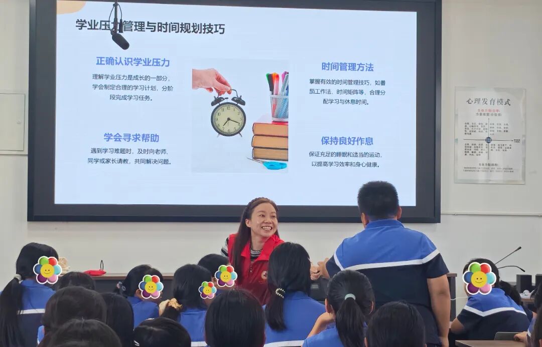 随后,王青婵巧妙地转变角色,化身为亲切的老师,深入浅出地讲解青春期心理变化及其应对方式,鼓励同学们在老师和家长的引导下树立正确的人生观和价值观,学会建立良好的人际关系,以积极阳光的心态坦然迎接青春期的到来。她建议同学们遇到困扰时主动向老师、家长和同学求助,让青春期少一些烦恼,多一些阳光。此外,她还引导同学们要正确认识学业压力,并传授时间管理技巧,为同学们成长之路再添一盏明灯。讲堂尾声,王青婵以家长的身份真诚地表示,愿与同学们携手并肩,共同迎接青春期的挑战,一起奋进前行。
