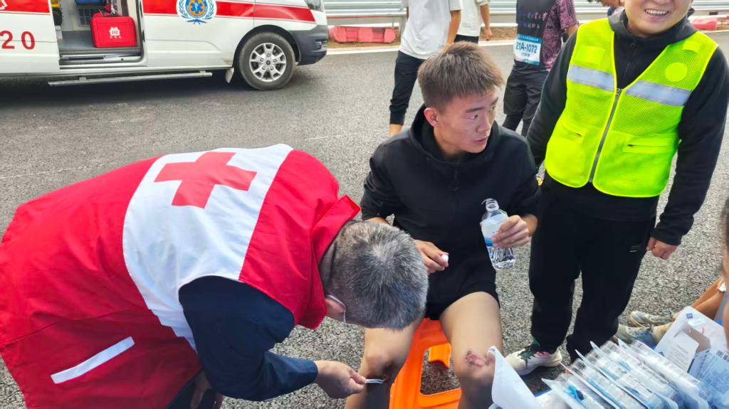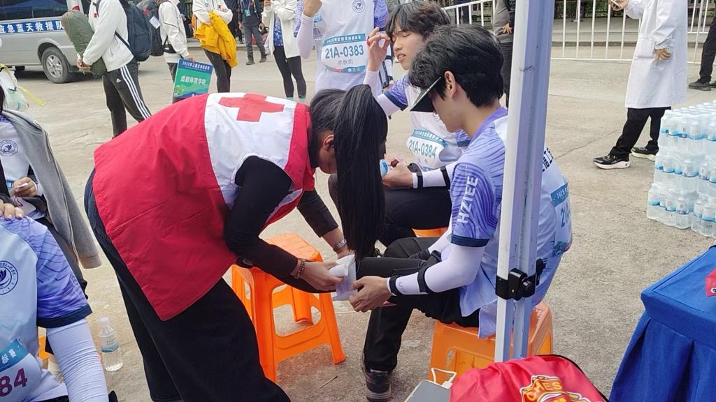 赛事期间,志愿者们早早抵达各自岗位,携带自动体外除颤仪(AED)和急救包等急救设备,驻守在赛事起终点及关键路段点位,与医护人员密切配合,构建起“流动急救站+固定医疗点”的立体保障网络。由于雨天路滑,跌倒导致膝盖擦伤的选手时有发生,志愿者第一时间上前,迅速为其进行消毒、包扎等处理,有效缓解选手不适。据不完全统计,整个赛事期间,红十字志愿者累计处置肌肉拉伤、擦伤等轻症50余例,以专业的服务守护着每一位跑者的安全与健康。
