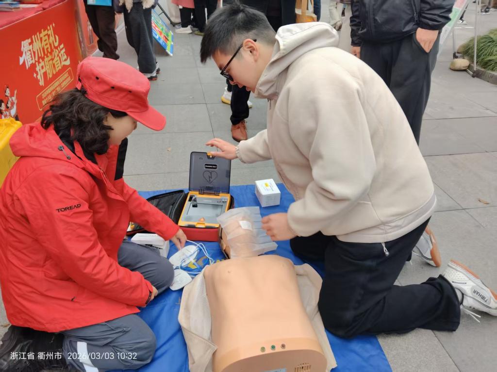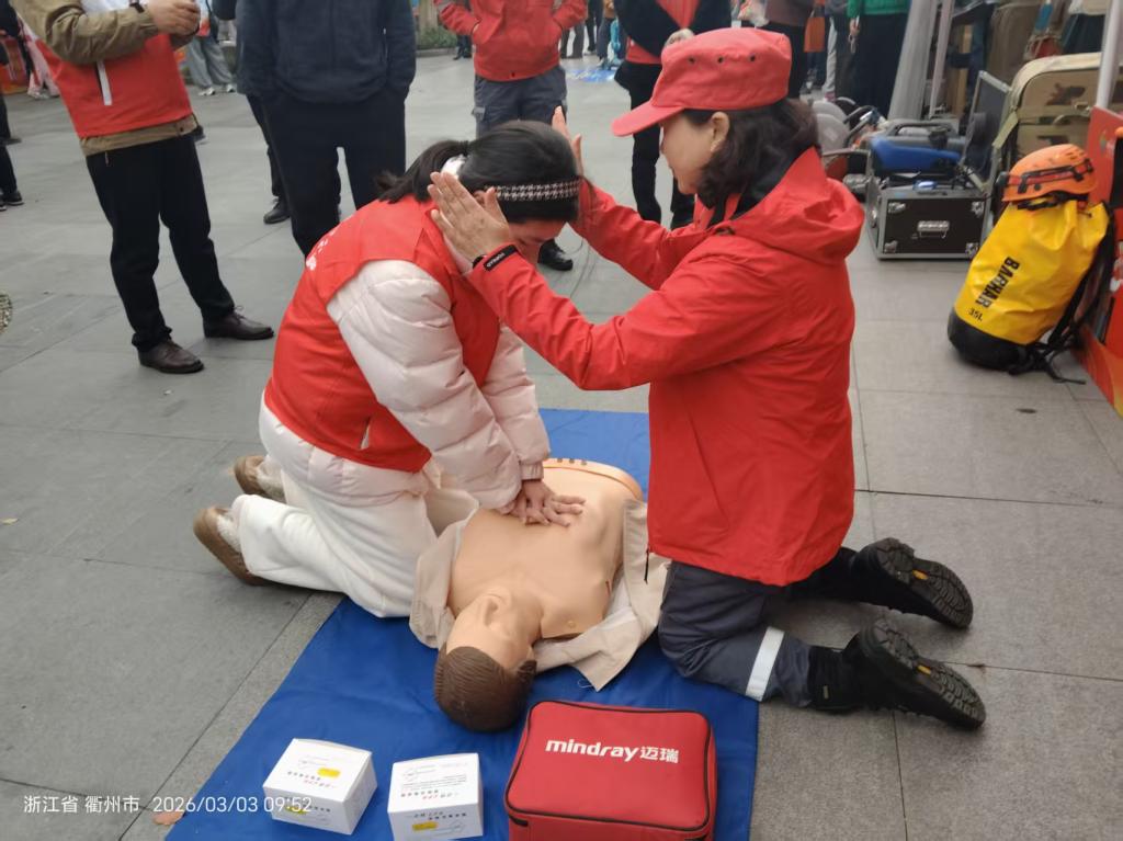 活动现场,红十字救援队员通过理论讲解、实操演示和互动体验的方式,向省运志愿者和现场市民系统讲解心肺复苏、AED使用、创伤包扎等核心应急救护技能,细致演示操作标准与动作要领。在救援装备展示区,专业急救箱、应急救援器材等设备一一陈列,队员们耐心讲解各类装备的功能与使用方法,帮助大家直观了解应急救援工作。