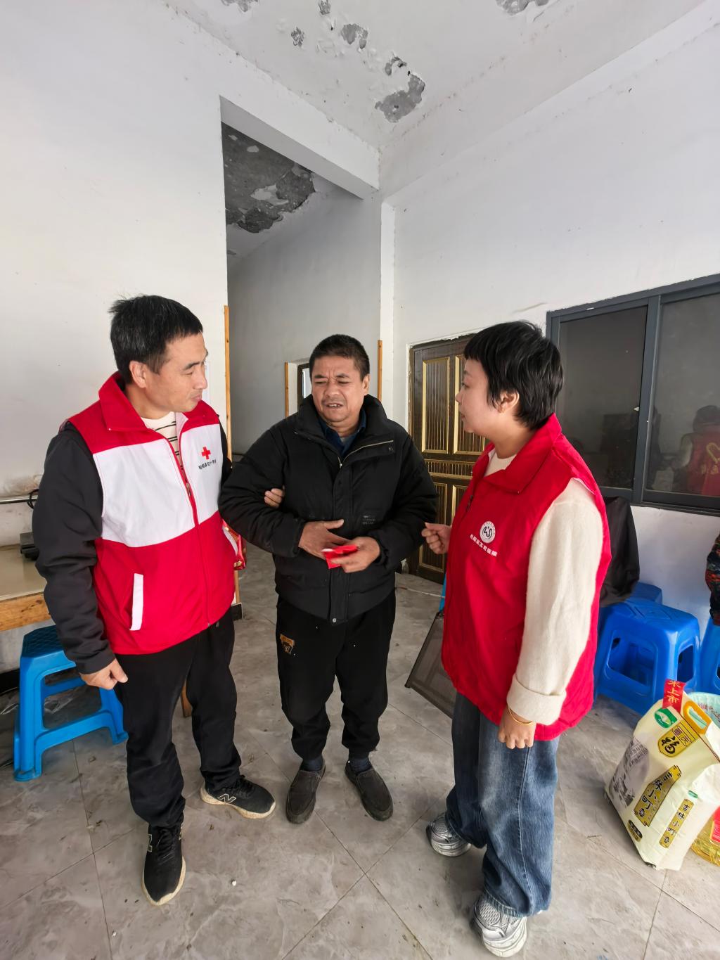 活动临近尾声,县红十字会志愿者和医院工作人员在当地干部的带领下,走访慰问象溪镇困难群众,为他们送上米、油等生活物资,并致以亲切问候。