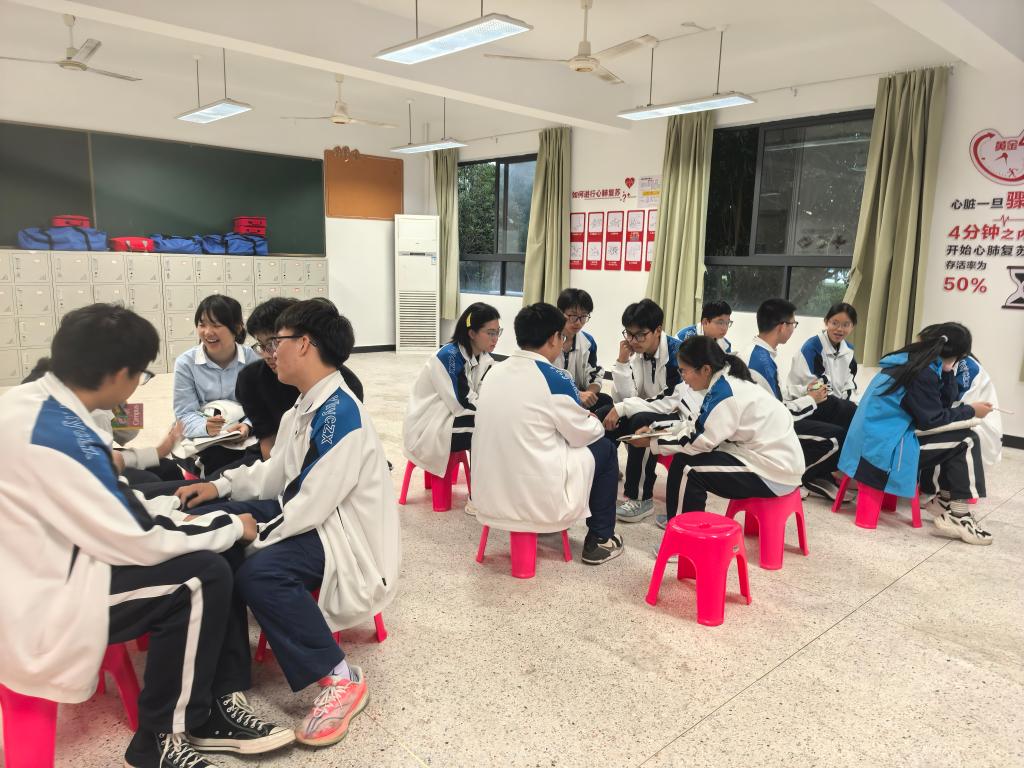 为避免理论学习的枯燥感,章晓敏邀请多名同学上台,让他们在黑板上写出心肺复苏的关键步骤,并结合书写内容进行逐一点评,纠正易错点,让抽象的理论变成可触摸、易记忆的要点。随后,同学们以5–6人为一组,围绕“遇到有人晕倒先做什么”“按压时力气不够怎么办”等实际问题展开交流讨论。章晓敏穿梭在各小组间,耐心解答疑问,引导大家进一步深化理解。“今天学习了应急救护知识,遇到突发情况我们也能第一时间帮助他人!”课后,一名同学分享了自己的学习体会。
