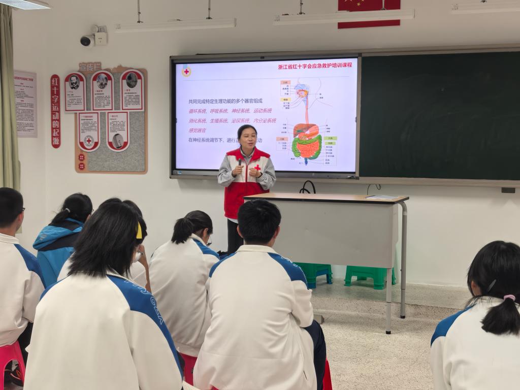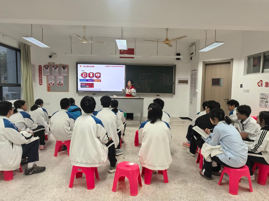 近日,作为全国学校急救教育试点学校,玉环市玉城中学依托今年新建的应急救护培训基地,开展玉环市首个“爱心急救社”学生红十字会社团活动。11月7日下午,特邀浙江省红十字一级应急救护师章晓敏担任主讲,开展应急救护知识普及社团课程,为同学们带来一场生动实用的心肺复苏理论知识授课,为校园生命安全教育注入“红十字力量”,切实推动应急救护教育在校园落地生根。