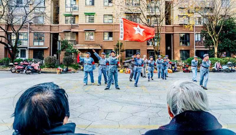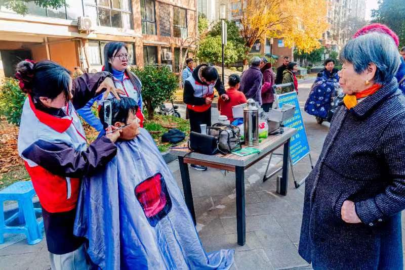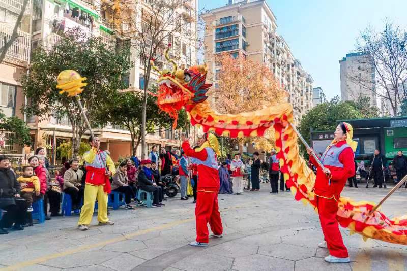 伴着阵阵欢呼,金黄巨龙在庭院中灵动起舞,引得老人们频频鼓掌叫好。舞台旁的便民服务区内,理发师傅耐心修剪发型,推拿按摩师精准舒缓筋骨,简单的服务中蕴藏着满满的贴心。