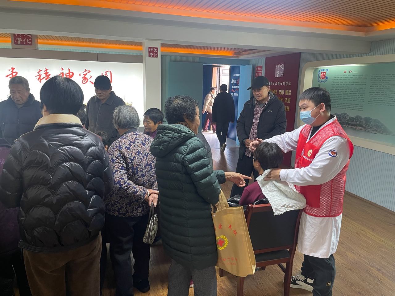 1月13日,舟山市普陀区红十字会老吾老志愿服务队走进虾峙镇东晓村河泥槽文化礼堂,为当地老年村民送医送药送服务。这是区红十字会新年首场志愿活动,当天吸引了周边三个村的百名老年人前来参加。